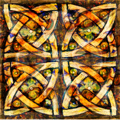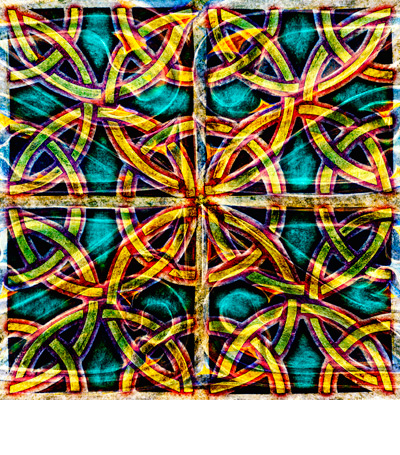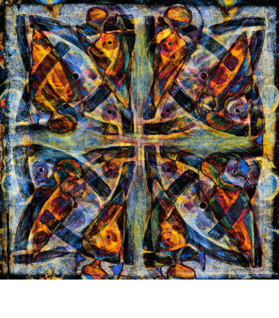 The images incorporate surviving decorative features from both St Cybi’s in Holyhead and Christ Church, united on either side of the sea as the resting place of Cybi’s relics. Few medieval features remain visible after G.E. Street’s restoration of the cathedral in the 1870s, while extensive late medieval stone carving can be seen on the south side of St Cybi’s. Patterns from this stone carving were layered with some of the medieval tiles that survive at Christ Church, to create these images for Esgyrn Cybi.