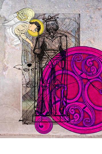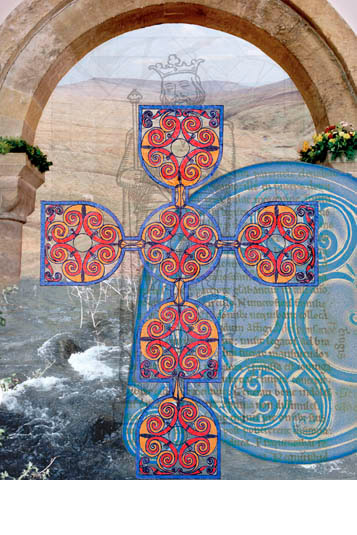 Gwynllyw is associated with Newport and the site of St Woolos Cathedral, and elements of the art and architecture of the cathedral feature in the images.